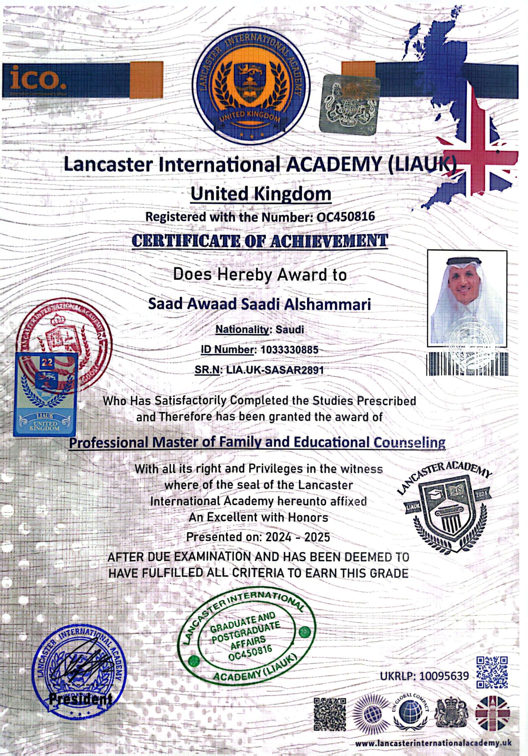 Lancaster International Academy is officially registered and governmental in Britain with registration number 14620579 and is approved by many British and international bodies (British Solicitor – Commonwealth countries – British Foreign Office – Apostille – all embassies of the world) The Academy specializes in providing vocational education at the level of higher education and postgraduate studies. The Academy works to provide and improve virtual education services.