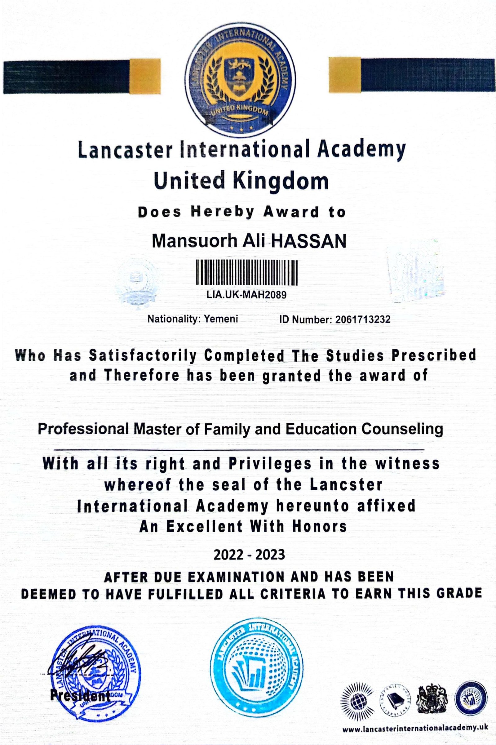 Lancaster International Academy is officially registered and governmental in Britain with registration number 14620579 and is approved by many British and international bodies (British Solicitor – Commonwealth countries – British Foreign Office – Apostille – all embassies of the world) The Academy specializes in providing vocational education at the level of higher education and postgraduate studies. The Academy works to provide and improve virtual education services.